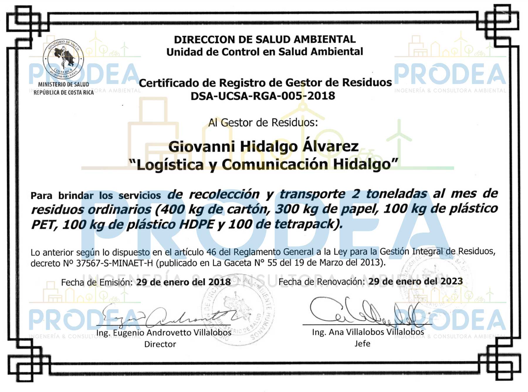 Promotora en el Desarrollo Ambiental S.A (PRODEA), su departamento en Gestión Ambiental.